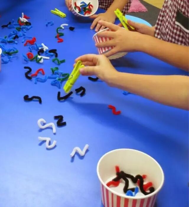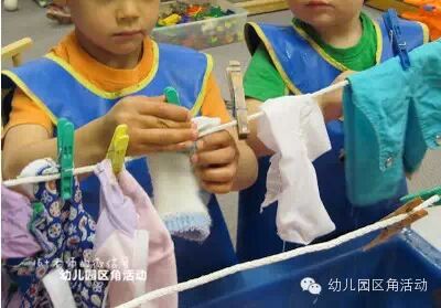 玩夹子:娃娃家能玩,小朋友乐于扮演爸爸妈妈进行模仿晾衣服的游戏,同样也能用小夹子玩出其他花样,这类材料是锻炼他们小肌肉的利器哦。